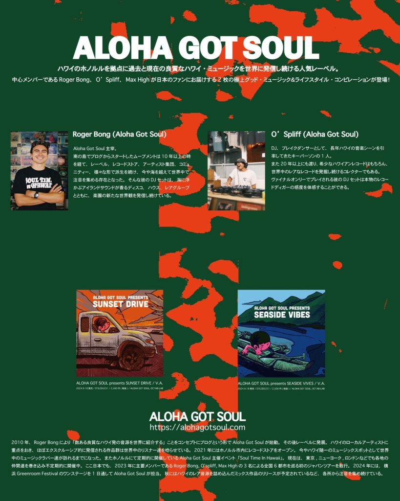 ALOHA GOT SOULのDJチーム(ROGER BONG、O’SPLIFF、MAX HIGH)が日本のファンの為に、ハワイでのドライブをイメージした特別にコンパイルしたコンピレーションを9月に2枚同時リリース。10月には全国11カ所で来日ツアーが決定。